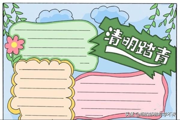 首先写上“清明踏青”的报头,画出报头边框,左下角画一个文字框,加几条柳枝,再画两个长方形文字框和云朵,将报头边框涂成深绿色蔬菜背景涂成浅蓝色,用绿色、黄色和粉色填涂手抄报,加上边框装饰线,画上横线,手抄报模版就完成了。